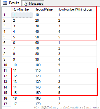 As can be seen from the result, the first 15 records were grouped into 3 groups of 5 each. The last 2 records don’t belong to any group of the size specified in @recordsInAGroup variable and are therefore easily identifiable for further processing.