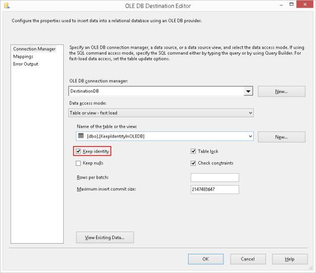 The “Keep Identity” option, as the name suggests controls the ability of the OLE DB destination task to insert data into an IDENTITY column. IDENTITY columns are quite a commonly used functionality to provide an auto increment value in a table. When migrating data from one system to another, it may be required to preserve the identity values during the migration.