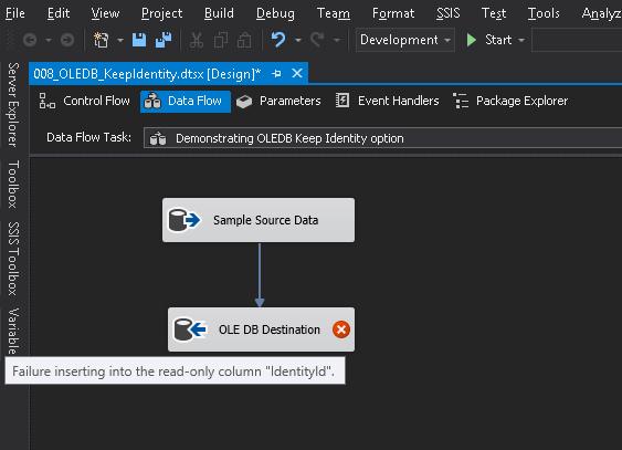 The “Keep Identity” checkbox checked is like setting the IDENTITY_INSERT option to ON when inserting data into a table using T-SQL. Only difference is that the option is set to OFF once the package execution completes, and hence no explicit handling is required.
